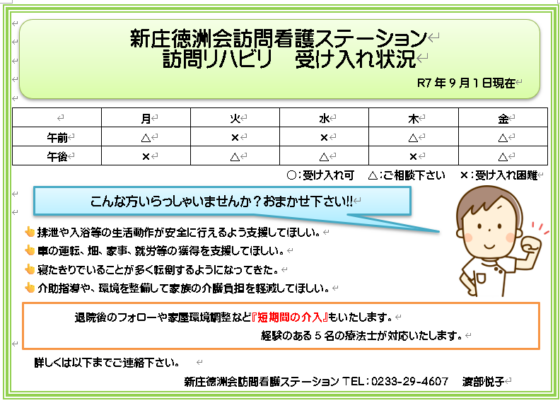 R7年.9月の空き状況を更新しました。 2025年9月4日 お知らせ 現在の空き状況は以下の通りです。 ご利用を検討の際は、事業所あるいは担当ケアマネージャーへご相談いただきますようお願いいたします。 新庄徳洲会 訪問看護ステーション 管理者 渡部悦子 TEL/FAX:(0233)29 – 4607